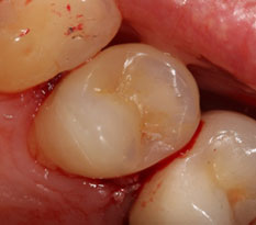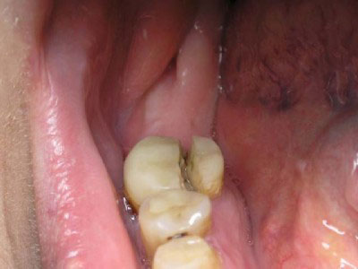 По аналогии, здесь речь идет о тех случаях, когда зуб мудрости все же частично смог прорезаться, но не до конца. Что ему чаще всего мешает? Либо мощный костный выступ челюсти, либо неправильное положение зачатка, либо соседняя 7-ка… вобщем причин может быть много, суть остается неизменной – часть непрорезавшегося зуба остается внутри, а часть – торчит снаружи. Это наиболее частая ситуация и именно она чаще всего и приводит к различным реально ощутимым проблемам. Каким именно?