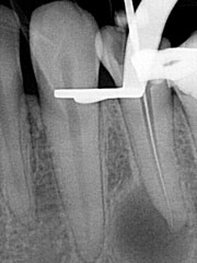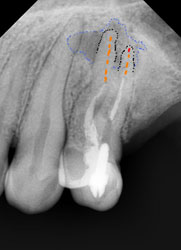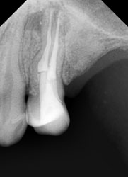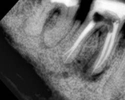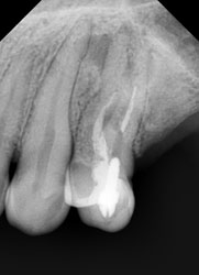 Что касается корневых каналов, то именно здесь и были основные сложности. Оба канала были не слишком здорово обработаны и запломбированы, в результате чего на обоих корнях появились гранулемы.