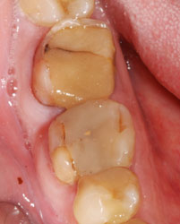 Такая же негерметичная пломба, такой же анкерный штифт… при этом твердые ткани сохранены гораздо лучше первого случая. По всему периметру зуба граница полости находится выше уровня десны, а, значит, по крайней мере, прогноз на долговечность реставрации будет вполне оптимистичным.