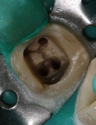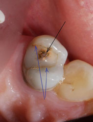 ![]() | Вначале врач делает доступ к каналу (-ам) зуба. В разных зубах их, как правило, от 1 до 4…бывает и больше. На этом фото два отверстия по углам полости зуба - это и есть входы в корневые каналы |