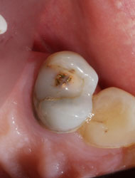 кариес корня соседнего 7-го зуба. Часто, когда 8-ка «застряла» и не имеет шансов прорезаться дальше, но и не беспокоит, пациенты и не думают обращаться к доктору, т.к. «не болит». На самом деле, такой полупрорезавшийся зуб, затрудняет нормальную гигиену в этой области и это приводит к поражению кариесом соседнего зуба. Причем самое неприятное в этом варианте то, что кариес развивается около самого основания зуба, развивается незаметно, полость долгое время может оставаться незаметной. В результате вырастает огромная «дыра», уходящая глубоко под десну, и восстановить такой дефект качественно не всегда потом возможно. Как финал – потеря хорошего соседа из-за неубранного вовремя «мудрого зуба». Причем восполнить утраченную 7-ку можно будет только имплантом (что недешево), либо съемным протезом (что неудобно в пользовании и заметно снижает качество жизни)