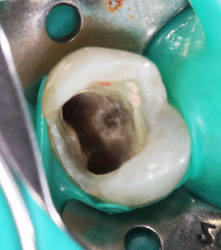 После удаления старой пломбы и анкерного штифта можно увидеть, что происходит внутри зуба под внешне вроде бы неплохой пломбой.