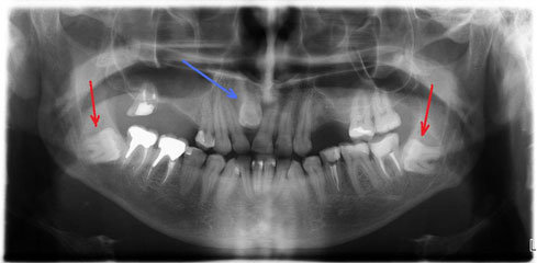 Такой расклад мог бы считаться вполне неплохим. Т.к. зуб лежит себе внутри челюсти, никого не трогает, не беспокоит… казалось бы, да и Бог-то с ним. Вобщем, так оно и есть. Бежать со всех ног выковыривать его из челюсти, пожалуй, не стОит. В таком виде он может пролежать там всю жизнь и хлопот не доставить. А может быть и не совсем так. Вокруг такого зуба может появиться т.н. фолликулярная киста. Поэтому лучше всего такие непрорезавшиеся зубы наблюдать, делая хотя бы 1 раз в год ортопантомограмму*. Ну… или удалить все же такой зуб, навсегда забыв про него и про необходимость слежки за ним. В конце концов, в жизни есть много других вещей, о которых приходится постоянно думать и помнить.