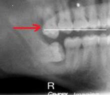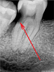 резорбция (рассасывание по-простому) корня соседнего 7-го зуба. Вобщем, ситуация аналогичная предыдущей, с теми же последствиями. Отличие лишь в том, что упершись в своего соседа, «мудрый зуб» может оказаться весьма настырным и своим давлением на 7-ой зуб вызвать рассасывание его твердых тканей.