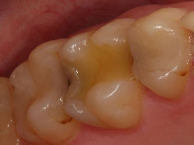 Ко мне обратилась пациентка с просьбой попробовать «спасти» нижний 6-ой зуб от удаления. Вот так он выглядел в полости рта.